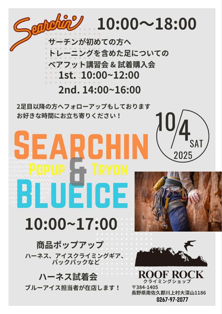 足元からクライミングを見直す「Searchin’」と、世界中のクライマーに支持される「BLUE ICE」が同時出店する貴重な機会です。ぜひお気軽にお立ち寄りください!
